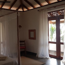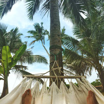 Es folgte eine herzliche Begrüßung durch die Gastgeber Claire, Paulina, Charlotta und Amal sowie eine Führung durch das kleine Paradies. Überall hingen Hängematten, direkter Zugang zum Strand und einen Blick auf das Meer – alles perfekt um die Seele baumeln zu lassen. Die Haushündin Nana und die zwei Katzen lagen friedlich im Schatten und schliefen. Wir hatten im ersten Stock ein wunderschön eingerichtetes, riesiges Zimmer mit umlaufendem Balkon und Blick auf Palmen und die rauschenden Wellen im Meer.